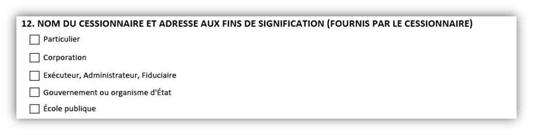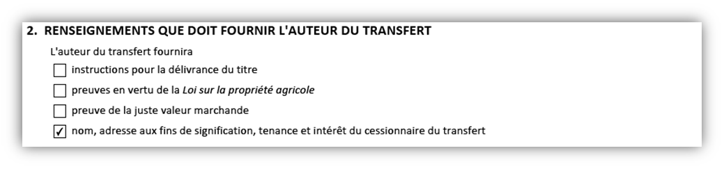Remarque : bien qu'il n'y ait qu'un choix à la case 2 pour indiquer qui fournit le nom du cessionnaire du transfert, l'adresse aux fins de signification et les renseignements sur la tenance et l'intérêt, ces renseignements sont recueillis dans deux cases distinctes sur le formulaire. Ces renseignements seront recueillis dans les cases 9 et 10 s'ils sont fournis par l'auteur du transfert et dans les cases 12 et 13 s'ils sont fournis par le cessionnaire du transfert.