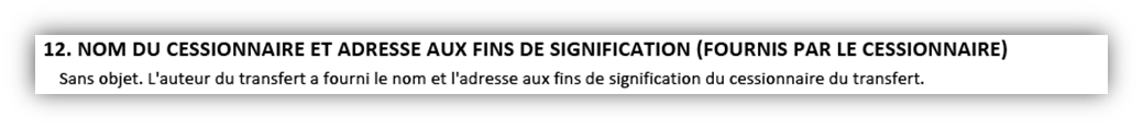 Si l'auteur du transfert fournit le nom et l'adresse aux fins de signification du cessionnaire du transfert, les cases 9 et 12 se présenteront comme suit :