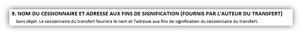 Si le cessionnaire du transfert fournit le nom et l'adresse aux fins de signification du cessionnaire du transfert, les cases 9 et 12 se présenteront comme suit :