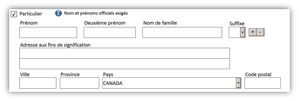 - Si l'on choisit Particulier, la case s'agrandit afin de faire apparaître plusieurs champs dans lesquels on peut ajouter un ou plusieurs cessionnaires du transfert (particuliers) ainsi que leurs adresses aux fins de signification.