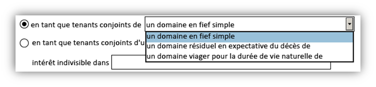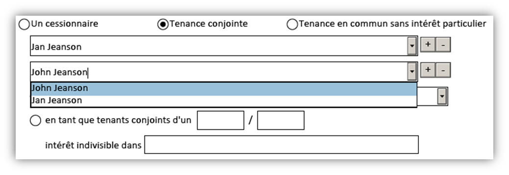 Une fois que les noms des cessionnaires du transfert auront été précisés, vous devrez choisir le type de tenance correspondant dans la liste déroulante. Voici les options :