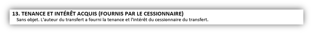 Si le cessionnaire du transfert fournit la tenance et les intérêts acquis, les cases 10 et 13 se présenteront comme suit :