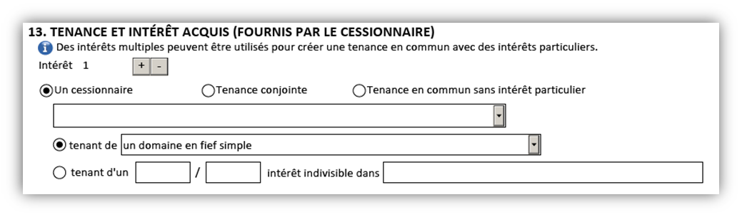 Une fois que le nombre d'intérêts a été précisé, vous pouvez fournir des renseignements sur l'intérêt particulier de chaque cessionnaire du transfert. Commencez par choisir l'une des options suivantes : un cessionnaire, tenance conjointe ou tenance en commun sans intérêt particulier. S'il n'y a qu'un cessionnaire du transfert, il s'agit de la seule option offerte au choix.