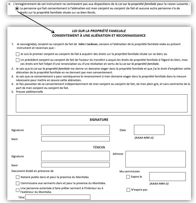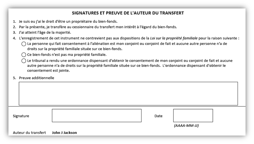 Si vous sélectionnez la première déclaration relative à la propriété familiale qui apparaît sur la liste, la page de signature pour le consentement à une aliénation et la reconnaissance en vertu de la Loi sur la propriété familiale s'ajoutera aux pages de signature de l'auteur du transfert qui doivent être remplies.
