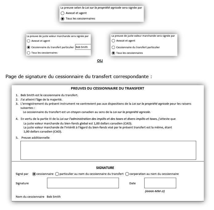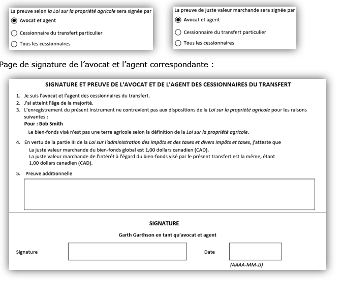 Si l'auteur du transfert fournit à la fois les preuves en vertu de la Loi sur la propriété agricole et les preuves de juste valeur marchande, et si le cessionnaire du transfert ne réclame pas d'exemption en vertu de la taxe sur les mutations de bien-fonds, aucune page pour la signature du cessionnaire du transfert n'est exigée.