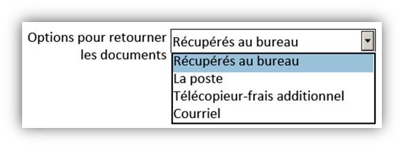 Utilisez le menu déroulant pour sélectionner les modalités de retour des articles demandés. Les options sont les récupérés au bureau, la poste, ou la transmission d’un courriel ou d’une télécopie (indiquez un numéro de télécopieur; des frais supplémentaires s’appliquent).